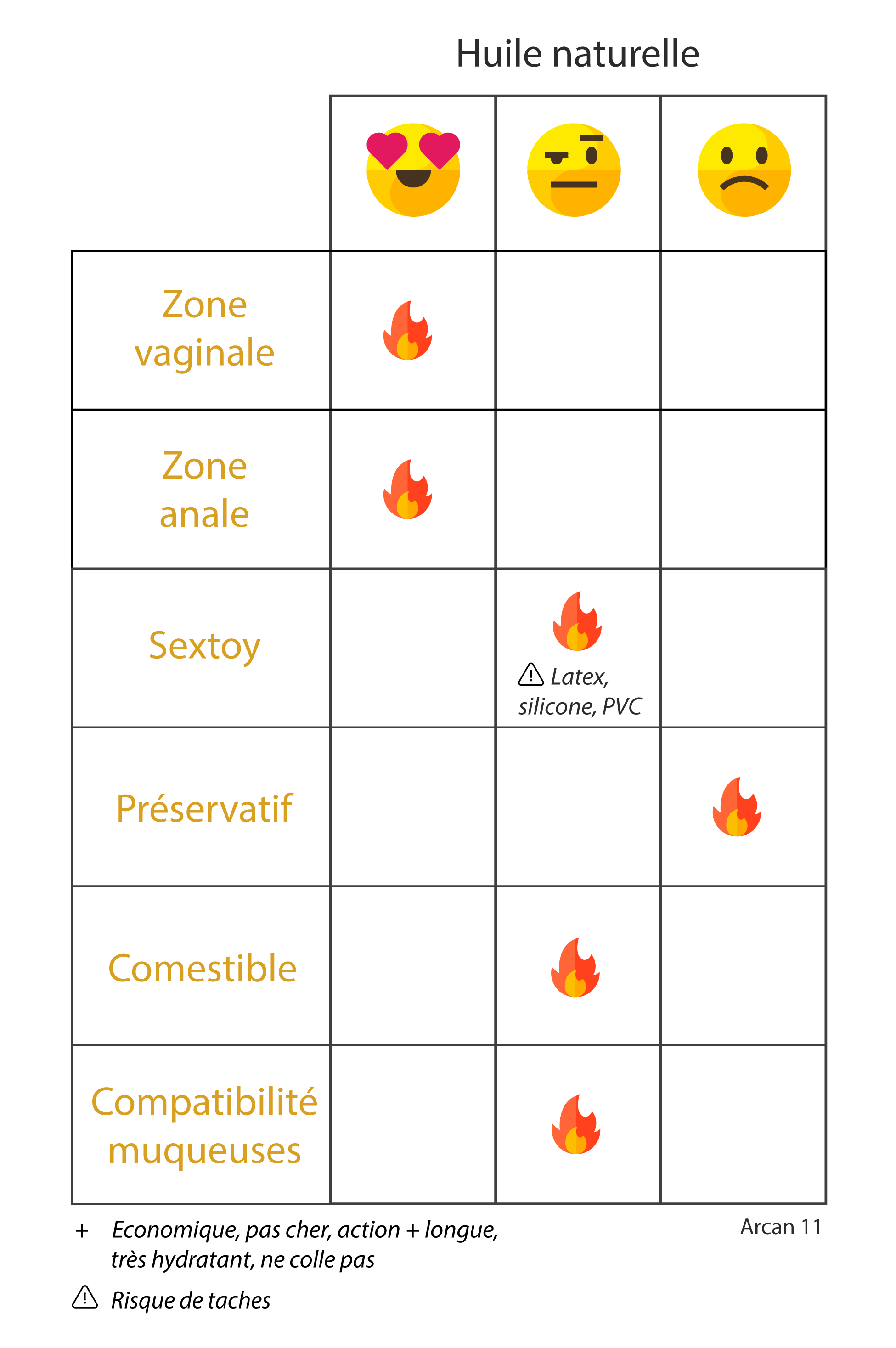 Les – : L’huile, quelle que soit celle utilisée, est incompatible avec les préservatifs et autres accessoires en latex car elle rend la matière poreuse. Il faut également éviter d’en utiliser avec les sextoys en silicone et pvc pour les mêmes raisons de porosité. L’huile est également difficile à nettoyer sur les draps.