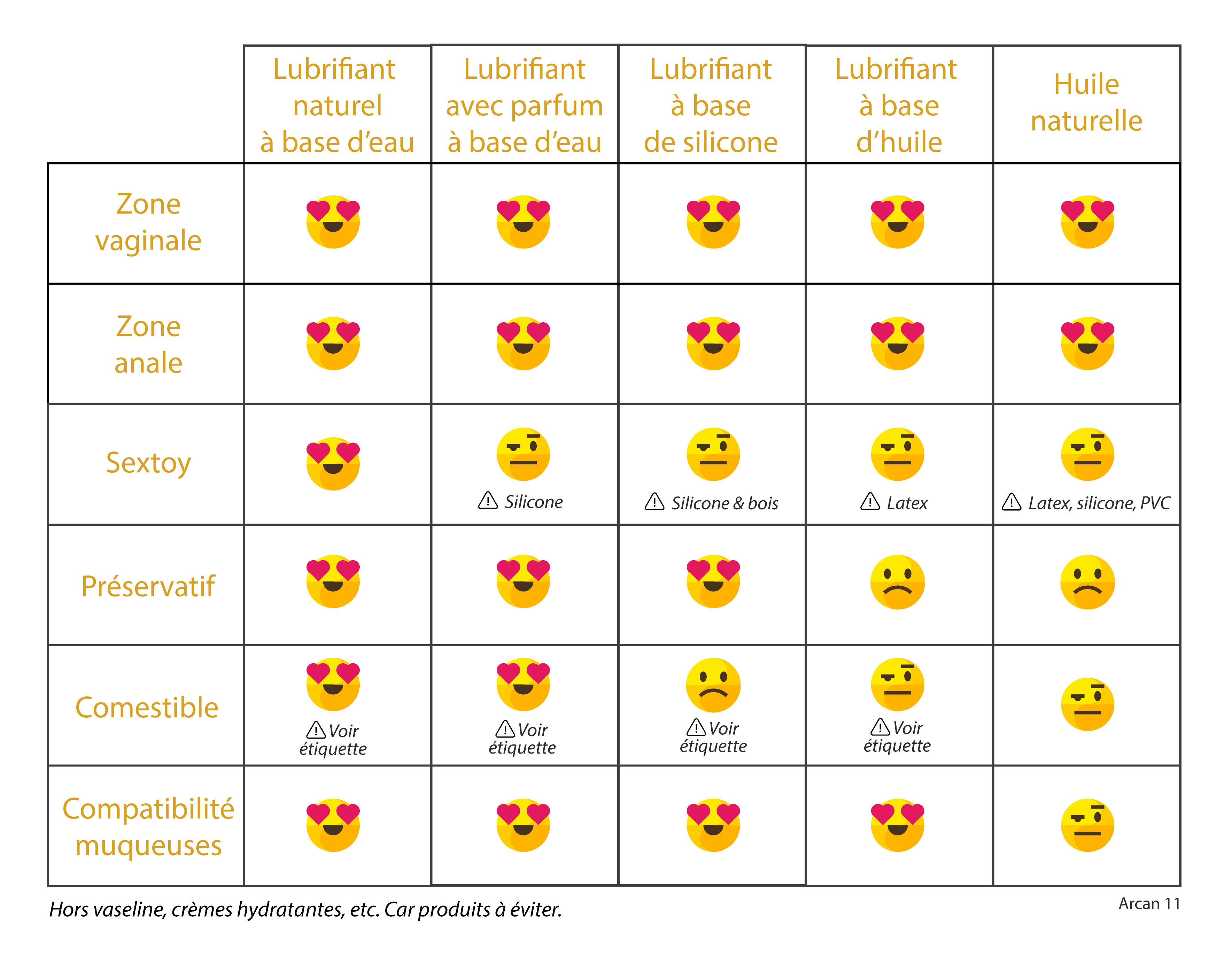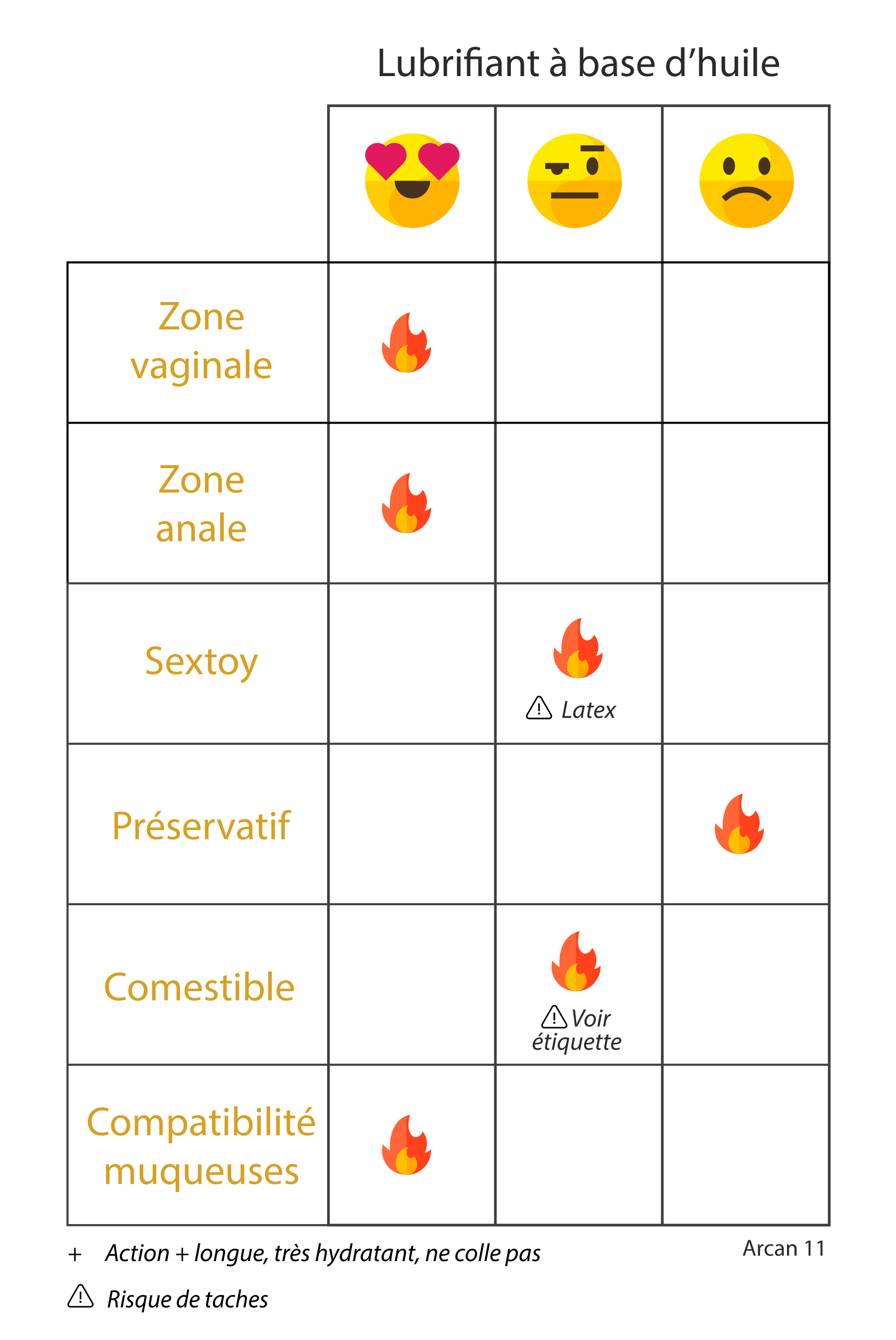 Les – : Le lubrifiant à base d’huile est incompatible avec les préservatifs et autres accessoires en latex. Il rend cette matière poreuse et risque de déchirer le condom. Il est par contre majoritairement compatible avec le silicone mais il est préférable de vérifier l’étiquette. Autre point négatif : la difficulté de nettoyage sur les draps.