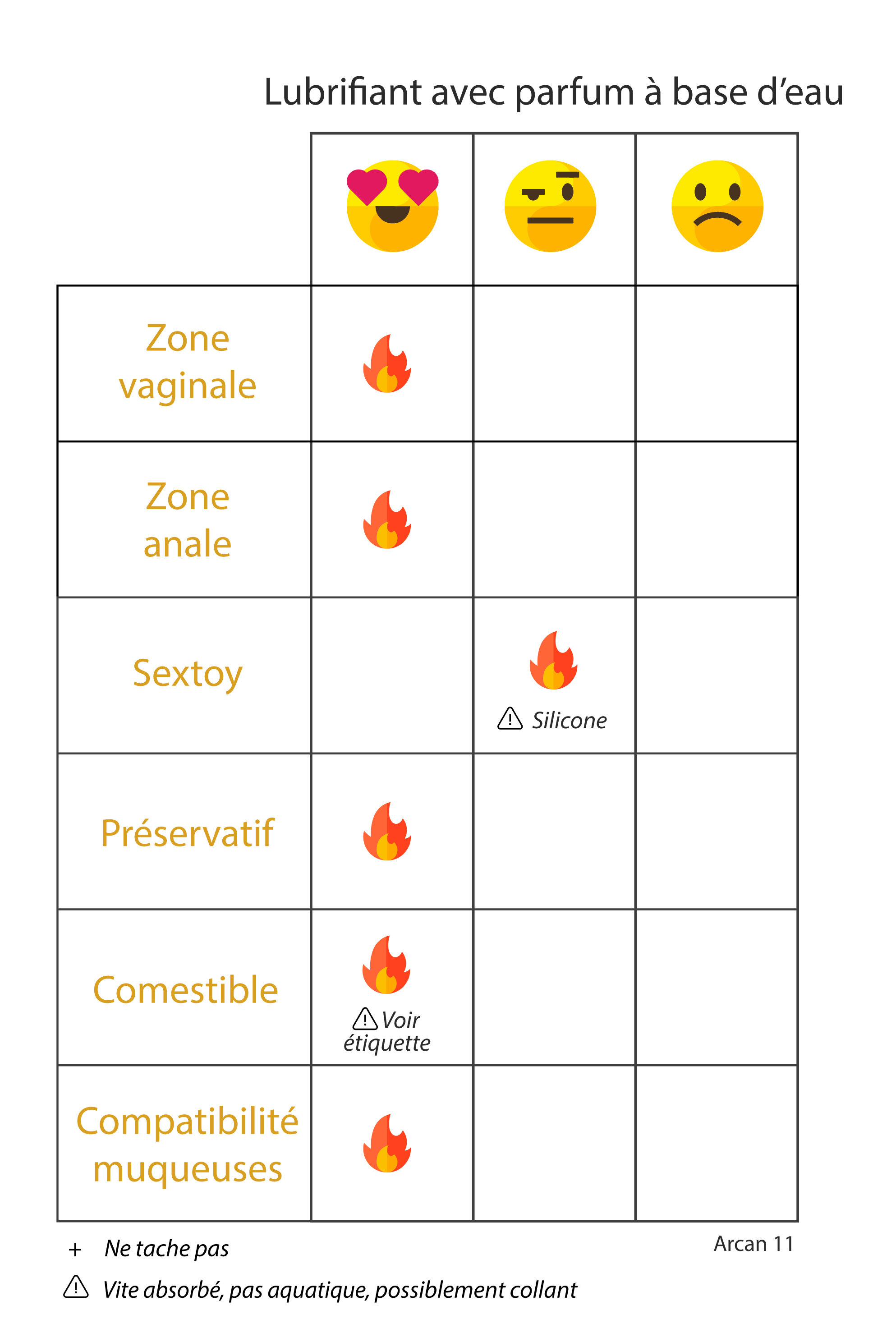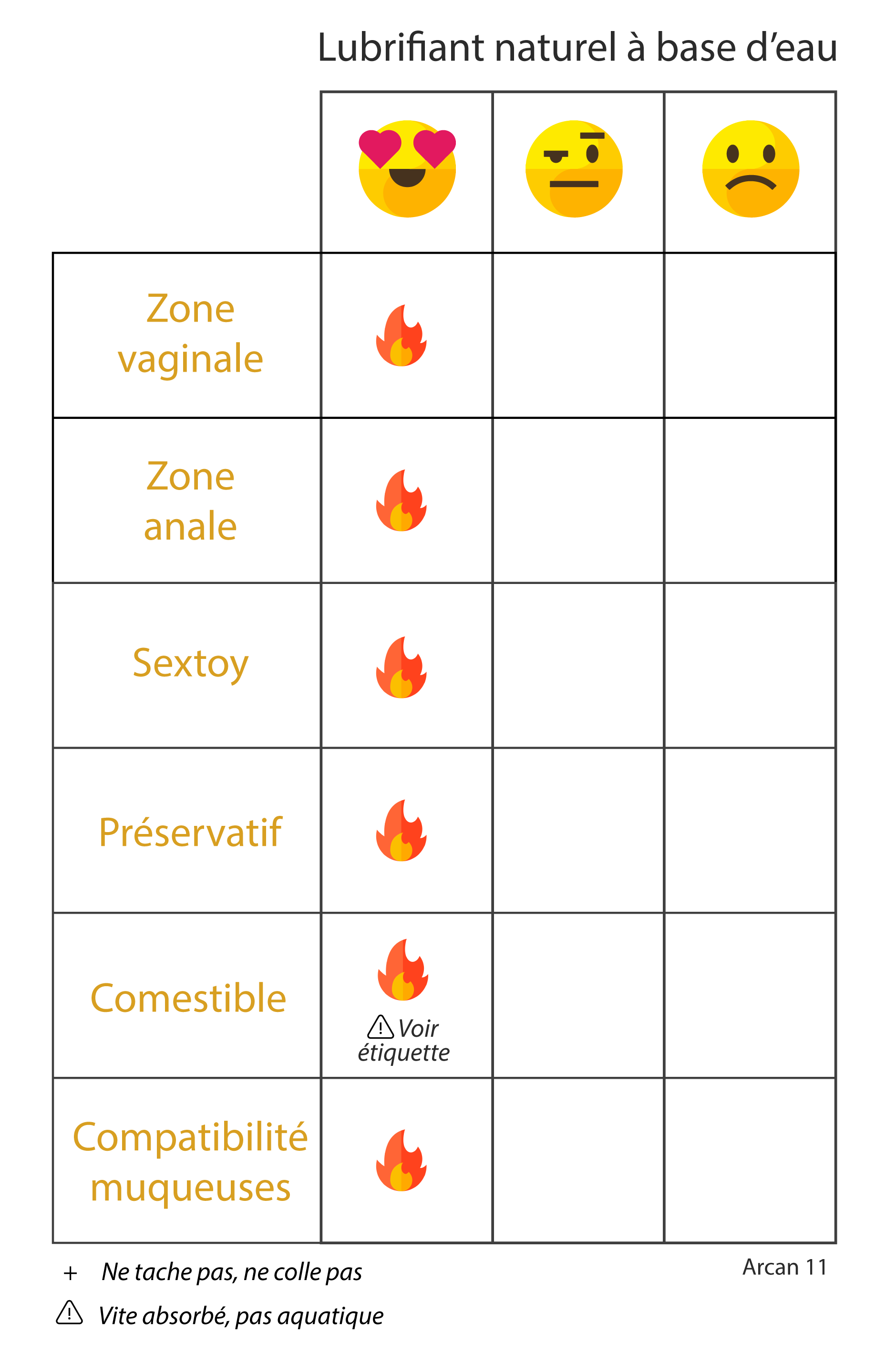 Les + : Tout comme les lubrifiants naturels, ils sont compatibles avec l’ensemble des sextoys (un peu moins avec les jouets en silicone, voir point négatif), pour toutes les zones intimes, les préservatifs et ils ne tachent pas. Ils sont majoritairement comestibles mais il est toujours préférable de vérifier l’étiquette.